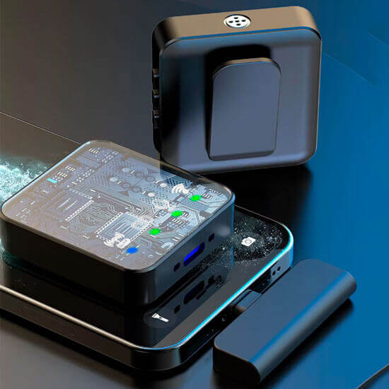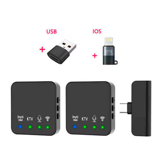 • Paquete incluye: 2 micrófonos recargables, 1 receptor de micrófono, 1 cable de carga USB, 1 manual de usuario, 1 adaptador para tipo IOS, 1 adaptador para tipo USB.
