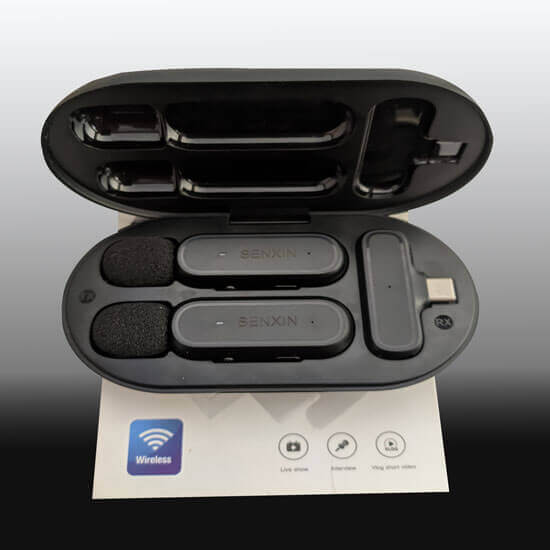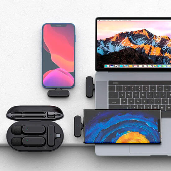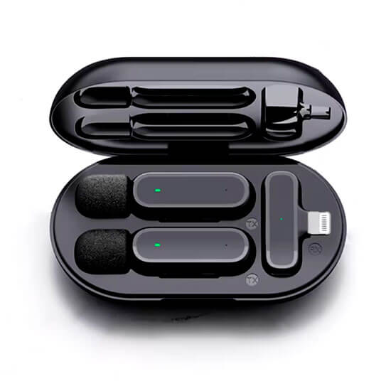 • Paquete incluye: 2 micrófonos recargables, 1 receptor de micrófono, 1 estuche de carga, 1 cable de carga USB, 1 manual de usuario.