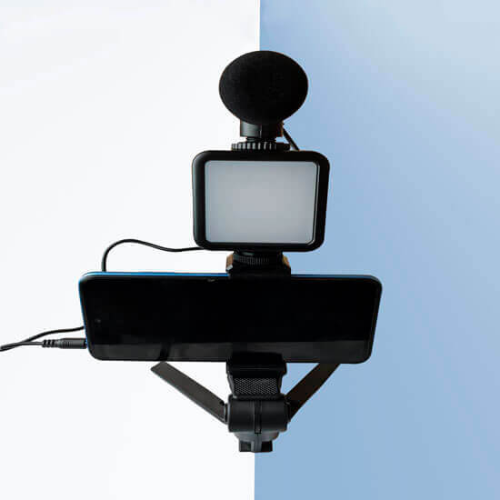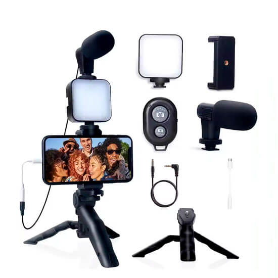 - Paquete incluye: 1 trípode, 1 soporte para teléfono móvil, 1 adaptador de cable de audio, 1 cable de audio, 1 control remoto bluetooth, 1 luz de relleno, 1 micrófono.
