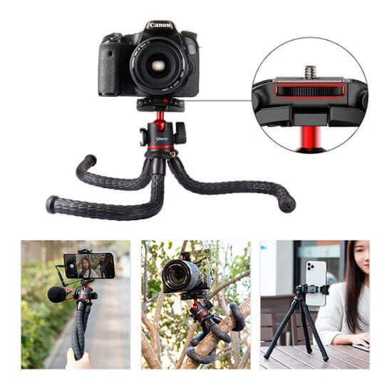 • Función: El trípode de pulpo está bien hecho y diseñado tanto para uso en interiores como especialmente en exteriores y tiene la flexibilidad de usarse a niveles muy bajos, por ejemplo para fotografiar flores, insectos, hongos o con sus patas enrolladas alrededor de un árbol, rama, valla, puerta; también se puede utilizar en superficies irregulares.